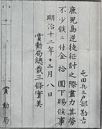 ⑤琴似屯田兵・三戸部勘吉に与えられた西南戦争の褒章の記録(琴似屯田百年史編纂委員会『琴似屯田百年史』1974琴似屯田百年記念事業期成会)