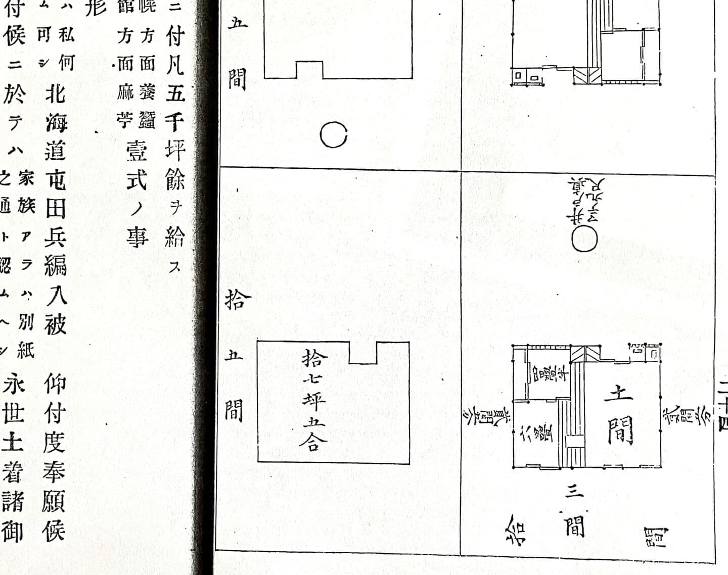 ついで、開拓使が明治8(1875)年1月12日付けの宮城、青森、酒田の3県に対して屯田兵の徴募を求めた開拓使の公文書「府県達第一号」に、4畳半+6畳間の「屯田兵居宅略図」⑦が添えられていることが明らかになりました。屯田兵希望者に具体像を示す資料で、文書の日付に兵屋は完成状態にありましたから、事実を反映した資料と考えられます。