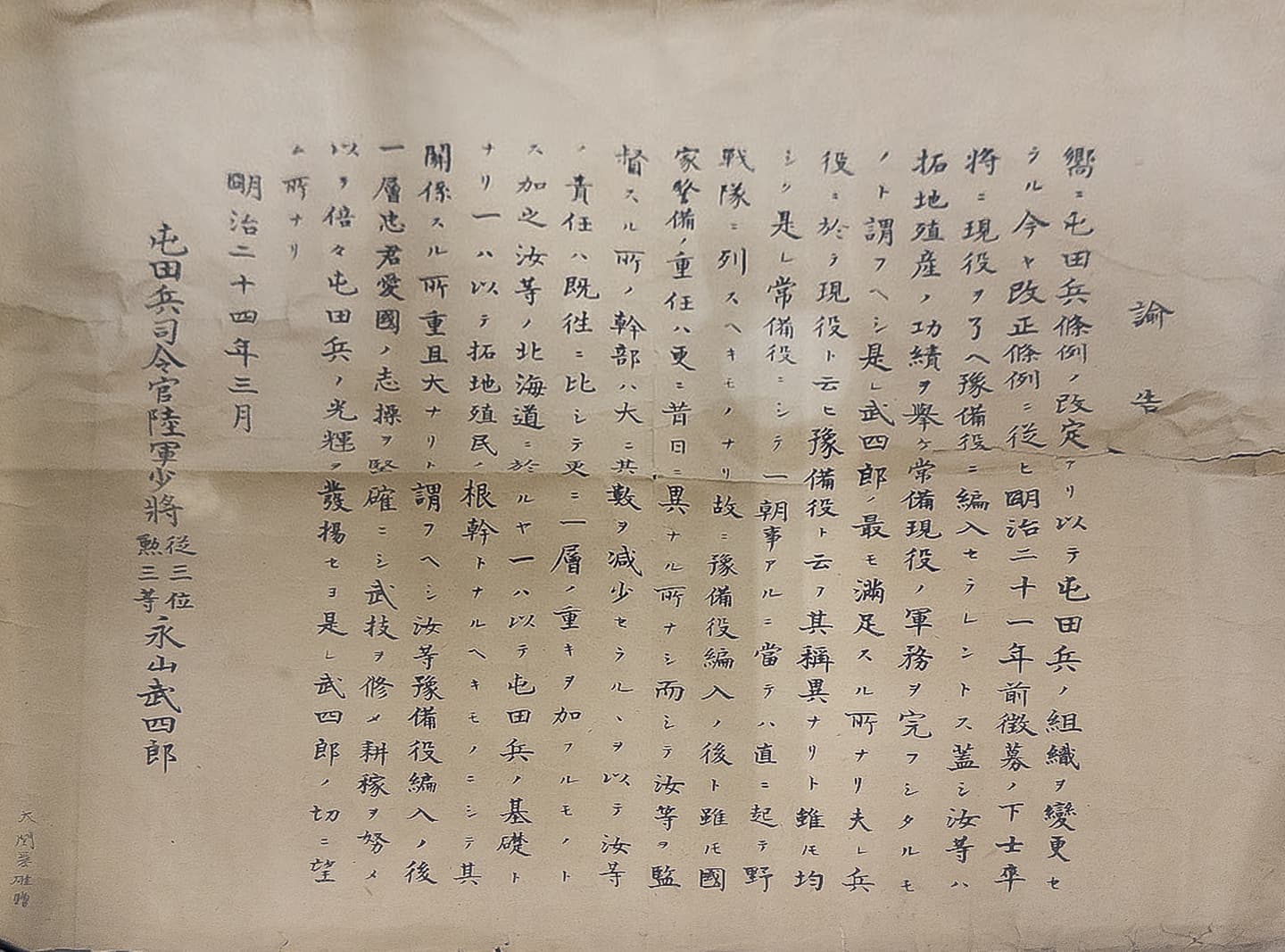 ⑨明治24年琴似屯田が現役を終えるにあたって屯田兵司令官永山武四郎が与えた諭告。現役を終えても北海道の拓地植民の根幹としての自覚を求めている